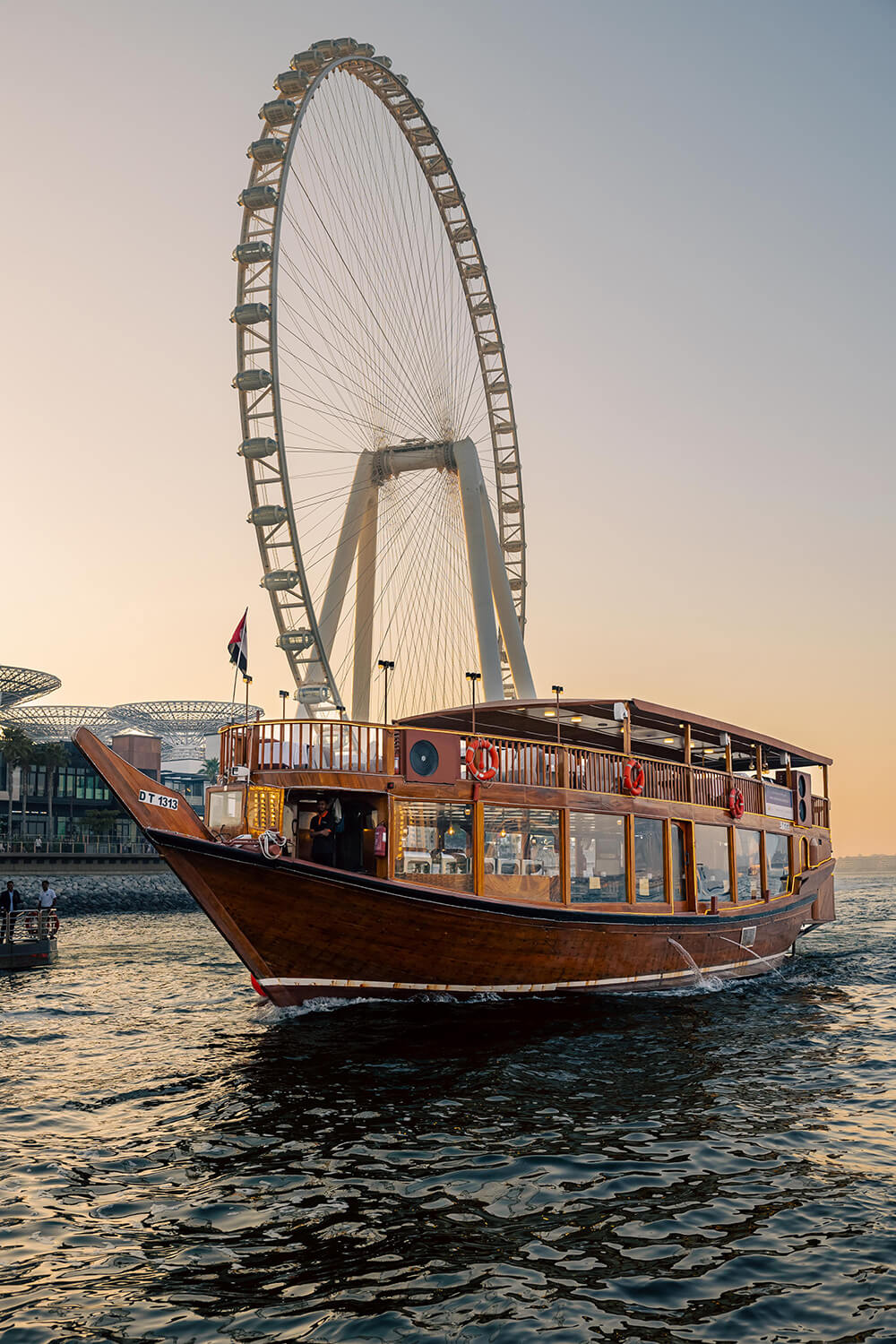 Having dinner on a traditional Arabian dhow boat offers a fantastic opportunity to witness the breathtakingly popular Dubai coastline with its renowned skyscrapers, including Blue Waters Island with the world’s largest ferris wheel – Ain Dubai, stunning yachts, and the sea of lights from the largest city in the Emirates.