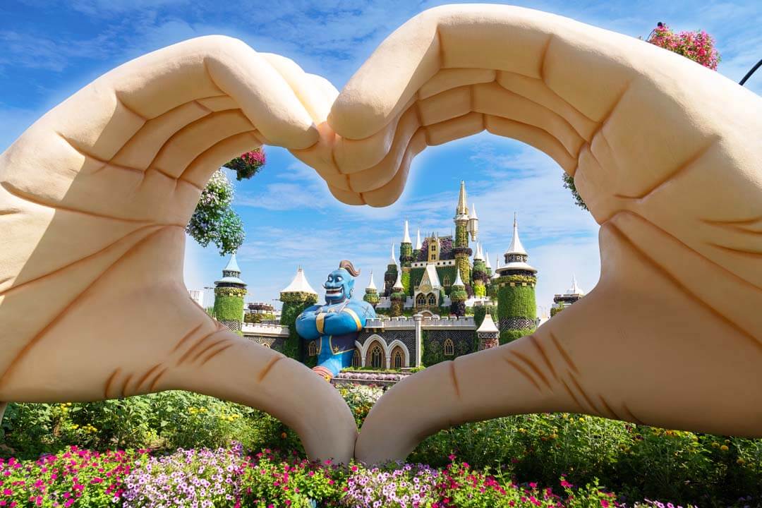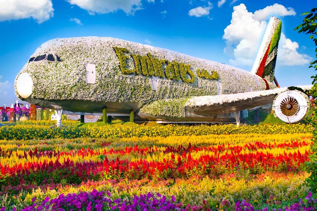 The garden is a symbol of human creativity and engineering ingenuity: over 50 million blooming flowers are transformed into gigantic shapes, arches, castles, hearts, airplanes, and beloved cartoon characters. One of the most impressive highlights is the floral replica of the Emirates A380 airplane — the largest flower installation in the world, officially recognized by the Guinness World Records.