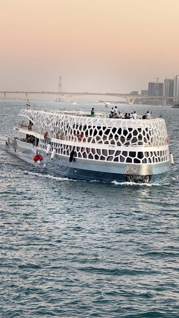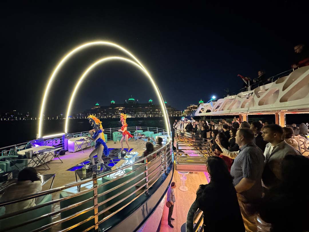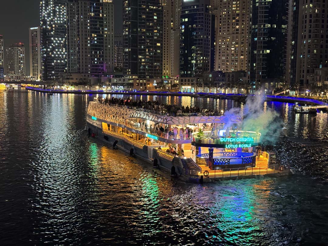 Enjoy an unforgettable evening aboard the elegant 220-foot Lotus Mega Yacht as you cruise through the sparkling waters of the Arabian Gulf.