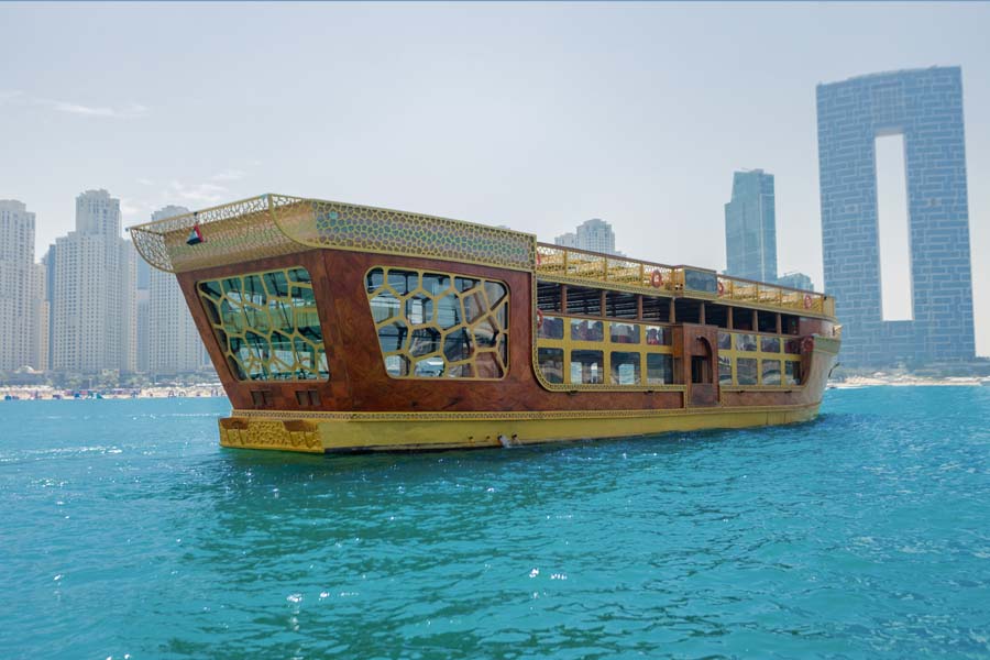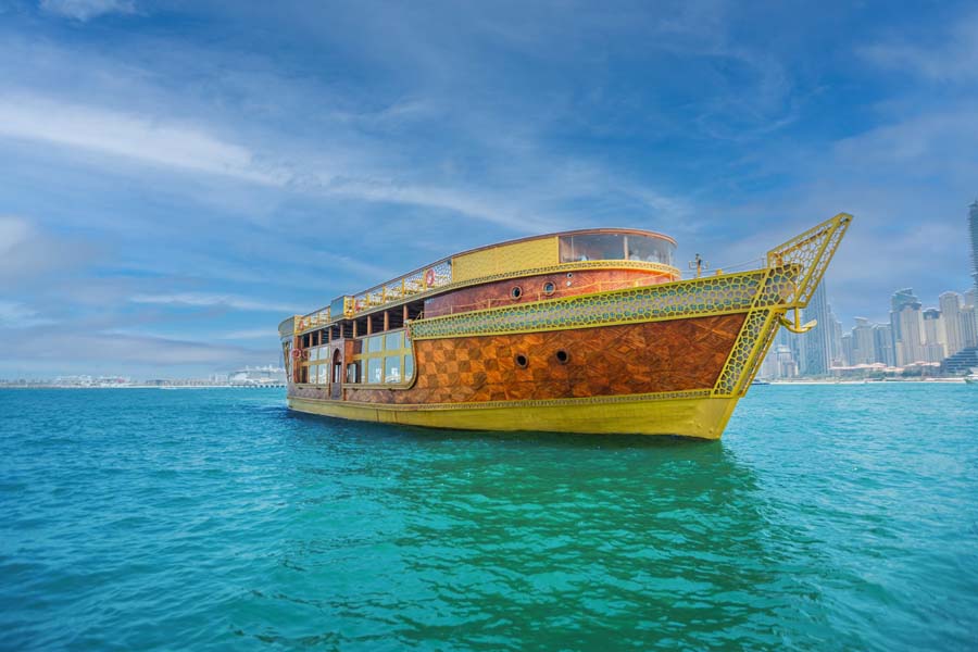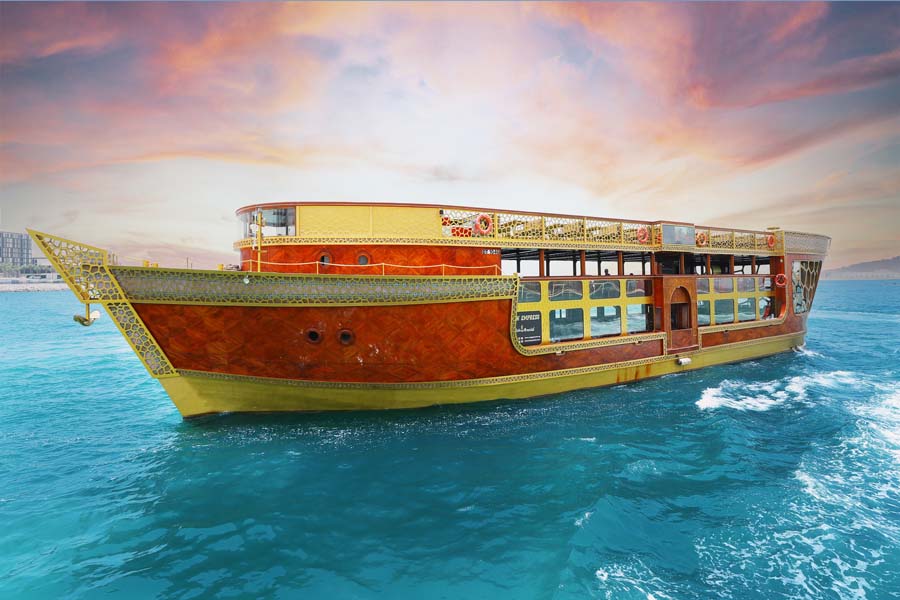 The Ocean Empress is a luxurious, 2-hour dinner cruise on the world’s largest traditional boat in Dubai, offering panoramic views of landmarks like the Palm Jumeirah and Dubai Marina.