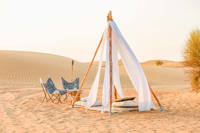 A short drive across the dunes will take you to a cozy lounge with panoramic desert views, where refreshing drinks and light bites are served to the sounds of ambient music.
