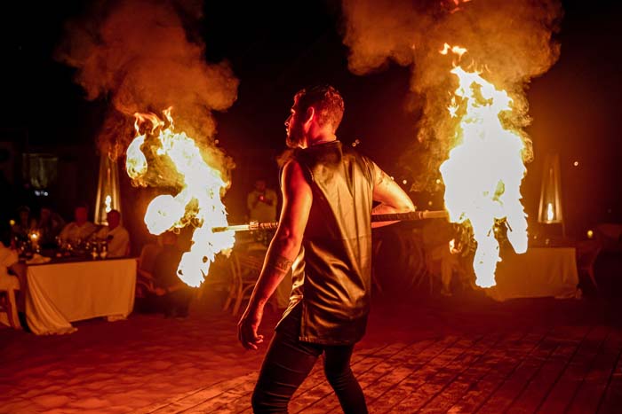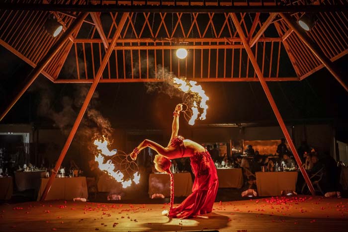 Entertainment awaits guests of all ages: sandboarding, volleyball, and archery, while the evening comes alive with a falconry show, fire performance, music, and for children – a movie under the stars.