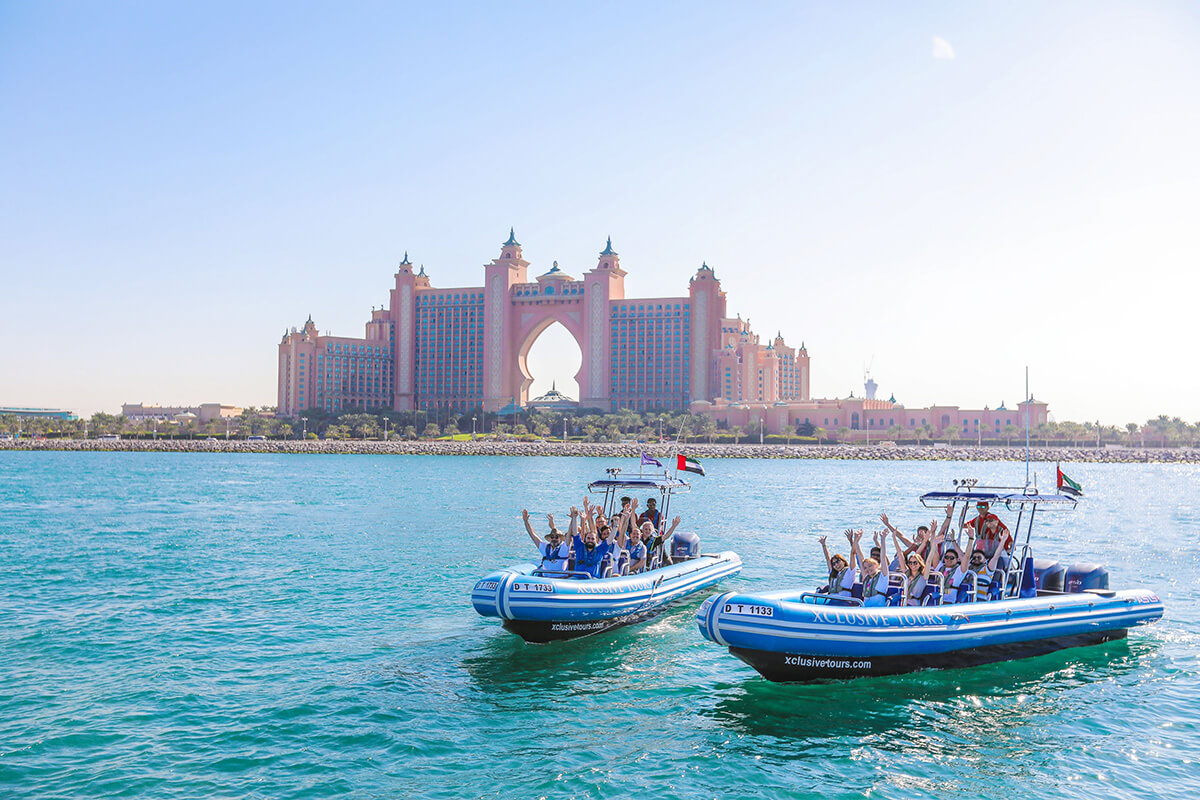 The boat races along Dubai’s spectacular coastline, offering panoramic views of the city’s world famous attractions. You’ll pass by the iconic Burj Al Arab, the man-made Palm Jumeirah island, luxury villas, and stunning yacht marinas – all under the shining sun, with the sea breeze in your hair and warm water splashing around you.
